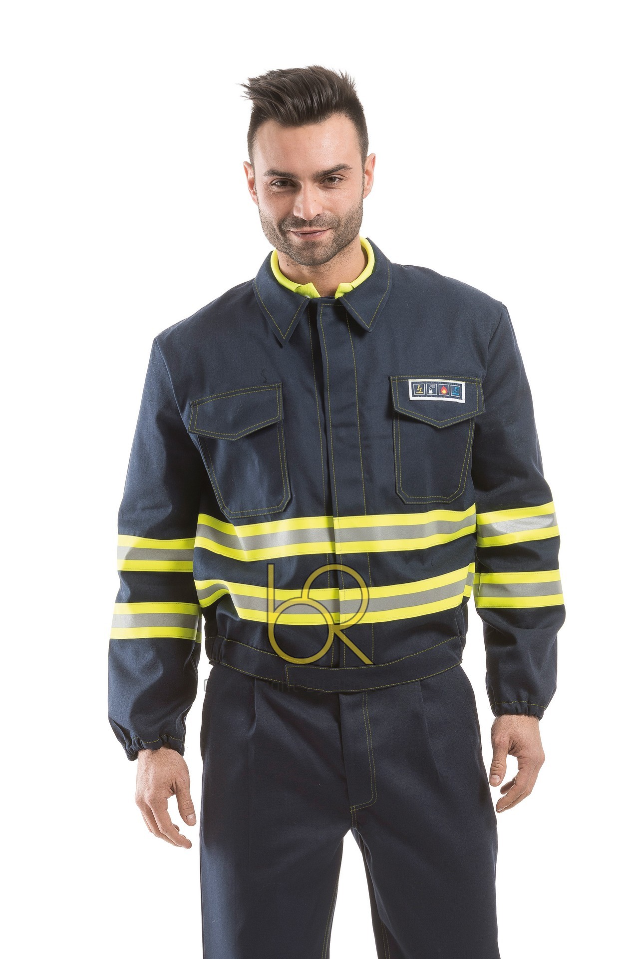 Elastico in vita e ai polsi. Applicate due bande riflettenti TRIM (giallo/grigio/giallo) in vita e sulle maniche.